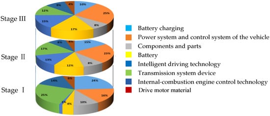 Finally, this study focuses on network content (see Figure 6). Among them, the proportion of battery technology increased from 4.34% to 17.32%, and is the fastest growing technology; vehicle power system and control system accounted for the largest proportion (25%), becoming the best-developing technology at this stage. Among them, three electric technologies (battery, motor, electric control) are still experiencing technical difficulty in the industry, and they urgently need to achieve technical breakthroughs.