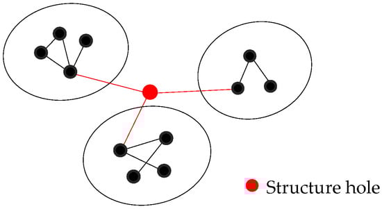 When two nodes in the network are connected to an intermediate node at the same time, but there is no connection relation between them, the intermediate node becomes a “bridge” for the information transmission [36], also known as the “structural hole” (see Figure 7). Compared with other members of the network, more innovative resources and opportunities for cooperation can be obtained by enterprises with structural holes [37].