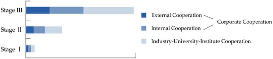 According to the different joint applicants of patents, this study divides the cooperation types into three categories: “external cooperation, internal cooperation and industry-university-research cooperation” (see Figure 10). Among them, the cooperation between enterprises and research institutions (include: universities and research institutions) accounts for a large proportion (43.73%), and there is no competitive relationship between the research institutions and enterprises. For enterprises, in the development process of frontier technology, research institutions are the most reliable cooperative partner [57,58]. Therefore, this study introduces the virtual variable “cooperation type”. If the enterprise has cooperation with a research institution, it is recorded as 1; otherwise, it is recorded as 0. According to the results, the industry-university-research cooperation plays a major role in promoting the TI of enterprises.
