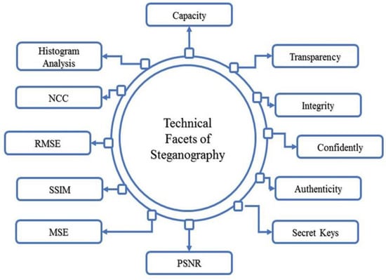 Figure 2 elaborates on the assessment parameters or aspects for any image steganographic algorithms. In the recent couple of years, different image steganography methods have been reported for image steganography, especially for image formats. In Table 2 the most common steganography techniques, especially PNG, Bitmap, and JPEG [11,28,29,30,31,32,33,34,35,36,37,38,39,40,41,42,43,44,45,46,47,48], are discussed. We critically analyzed different image steganography algorithms and elaborated on the existing methods, procedures, techniques used, cover object, and size of the embedding message. While Table 3 elaborates on the critical analysis of these different file format image steganography methods using measuring algorithms or essential criteria of image steganography. A detailed explanation is given in the tables respectively.