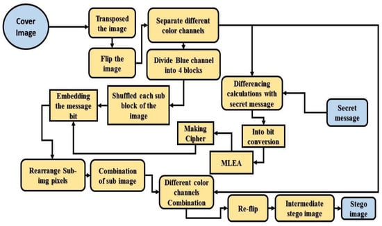 In this section, we explained an abstract form of the basic mathematical formulation of the proposed algorithm and the basic definition of the main concepts used for embedding the secret message within the image. Figure 3 elaborates on the whole module of the proposed algorithm. Selecting a cover object first transposed, flipped the cover image, and separated the colors channel of the cover image. After the separation of the color channels blue channel is further divided into four equal blocks, then shuffle the sub blocks of the channel by magic matrix (discussed later) because the blue channel is used for embedding the secret message bits. On the other side, the red channel is used with secret message bits differencing calculations and then converted into the bit; after conversion into bits, applying the Multi-Level Encryption Algorithm (MLEA discussed in the given section) for making the cypher text. Finally, the cipher is embedded into shuffled blocks of blue channels. After completion of the embedding process then, rearrange the sub-images, combine the color channels, and make the intermediate stego image. The extraction algorithm is the reverse process of the embedding algorithm. The complete step-by-step process of embedding and extraction algorithms is given in Algorithms 1 and 2, respectively. Figure 3 shows the whole embedding process of the proposed algorithm.