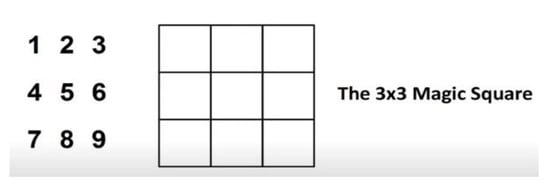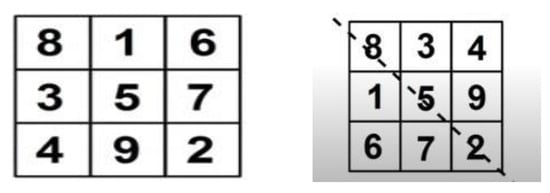 Magic matrix is a Matlab function that creates a magic n-by-n matrix with an equal number of rows and columns constructed from int 1 through n2. It is necessary to create a valid matrix. Then its order must be greater than 3 and not contain any repeated numbers when taking the sum of all rows, columns, and diagonals because the summations of these three perspectives must remain the same. So McMx plays a vital role while working with image steganography because, through the magic matrix’s many properties, we can shuffle the pixels of the cover image from different perspectives. For more clarity on the magic matrix, let us explain with the help of an example. Place the numbers 1 to 9 so that each row, column, and diagonal adds up to the same numbers as shown in Figure 4.