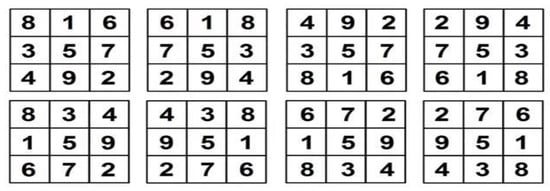 Prove that there are no other ways by finding all possible arrangements. Considering the above 3 by 3 magic matrix, try to make all the possibilities; eight are shown below in Figure 5.