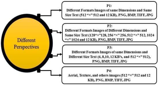 Figure 9 elaborates different perspectives, for the critical analysis of the proposed work. P1, we have used these different formats (png, bmp, jpg, tiff, etc.) images with the same dimensions 512 × 512, and the size of the message 12 kb. P2 we also used these distinct formats of image with different dimensions 128 × 128, 256 × 256, 512 × 512, 1024 × 1024, and the secret message size is 12 kb. P3 present different formats of image with the same dimension, but the message size is different such as 6, 8, 10, 12 kb’s. While in p4, aerial, texture, and other images of the same dimensions of the different formats and the message size is 12 kb’s.