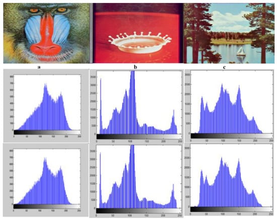 Figure 13 shows the histograms of some images, namely, ‘a’ for Mandrill, ‘b’ for Splash, and ‘c’ for Lake, which was critically analyzed using the proposed algorithm. We can find the exact occurrences of each image pixel using a Histogram. When the secret message is embedded in the cover image, the high similarity between the stego and cover image can be found using a Histogram because it shows the bit of distortion between the stego and cover image after embedding the secret message. However, the proposed algorithm is also critically investigated for cover and stego images of different formats using a Histogram of over 150 images. So the results outperform the others. CH shows the cover image histogram, and SH shows Stego image Histogram.