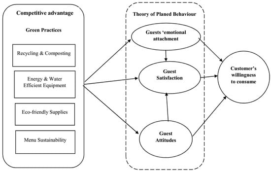 When restaurants adopt green practices, they can gain a competitive advantage, achieve green capability, and improve their image [51]. It also attracts new green customers, expands the segment market of eco-friendly products to green consumers, and increases customer satisfaction. Besides that, restaurants can save financial investment by implementing efficient water and energy consumption, waste recycling and composting methods, eco-friendly cleaning supplies and packaging, menu sustainability/eco-friendly products, and organic food [4,5,11,25,41,46,50,58]. Based on the discussed literature above and according to the TPB, the key determinant of customer behavioral intention (customer’s willingness to consume green products) include green practices, customer attitudes, emotional attachment, and customer satisfaction. We, therefore, propose the following hypotheses: