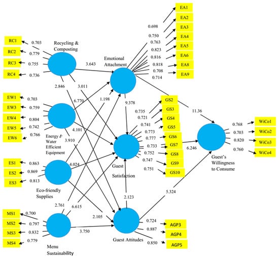 After running the PLS-SEM to test proposed hypotheses H1.1 (H1.1a, H1.1b, H1.1c, H1.1d); H1.2 (H1.2a, H1.2b, H1.2c, H1.2d); H1.3 (H1.3 a, H1.3 b, H1.3 c, H1.3 d), H2, H3, and H4 (H4.1; H4.2; H4.3) of this research model, non-parametric bootstrapping [67] was performed to examine the significance of the path coefficients in the inner model. Table 4 shows the results of the path coefficient of the inner model, illustrating that all hypotheses were significant because the confidence levels were higher than 95% (p-value < 0.05). Moreover, the path coefficient directly showed the relationship between green practices and customers’ emotional attachment, satisfaction, attitudes, and willingness to consume. Hypotheses H1 (H1.1; H1.2; H1.3), H2, H3, and H4 (H4.1; H4.2; H4.3) met the statistically significant standard and were completely supported. However, eco-friendly supplies of green practices and customer emotional attachment have not met the statistically significant standard (p-value = 0.231 > 0.05; t-value = 1.198 < 1.96; β-value = −0.056) and rejected H1.1c. The results indicated that the extended TPB model by DiPietro et al. [5] adopted from Ajzen’s TPB [5,6,8,28,34] included the significance of green practices; customer satisfaction, emotional attachment, and attitudes were predicated upon the willingness to consume green products. The findings were consistent with the proposed hypothesized and indicated a sufficient explanation of customer behavior toward green practices in this study. It also revealed that the higher the green practices of Recycling and Composting; Energy- and Water-Efficient Equipment; Eco-friendly Supply; and Menu Sustainability, the greater the customer satisfaction and attitudes toward green restaurants. Moreover, the findings revealed that the higher the green practices of Recycling and Composting; Energy- and Water-Efficient Equipment; and Menu Sustainability, the greater the customer’s emotional attachment toward green restaurants. Lastly, we could conclude from the findings that the higher the customer’s emotional attachment, satisfaction, and attitudes, the greater the customer’s willingness to consume eco-friendly products in restaurants, and vice versa. Figure 2 shows the structural model resulting from the PLS analysis.