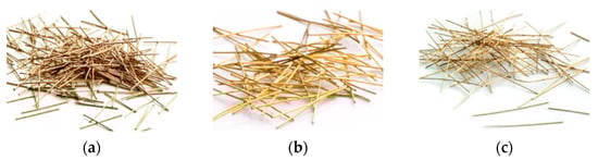 The steel fibers used in the study: (a) SF1, (b) SF2, and (c) SF3.