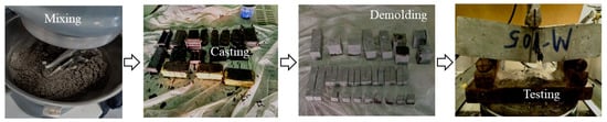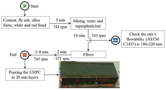 As illustrated in Figure 3, the mixing process was conducted by utilizing a peculiar concrete mixture (MischTecnich, UEZ ZZ, 50-S, 95 L capacity). The UHPC was produced in about 18 min following the four stages depicted in Figure 3. At the end of the mixing procedure, the UHPC was cast in 50 mm layers in the beam’s forms, including the prepositioned steel rebars. Additionally, for the compressive strength test, 50 × 50 × 50 mm cubes and for flexural strength, 40 × 40 × 160 mm prisms were cast for all concrete mixes. Eventually, all test samples were stored in a water container under room conditions (19–23 °C and 100% RH) for curing for 28 days. Finally, the cube compressive strength of the UHPC was evaluated following ASTM C109 using a universal testing machine (3000 kN capacity) at a loading rate of 3.33 kPa/min. Although the concrete mixture was designed to achieve a characteristic strength of 130 ± 10 MPa, it was kept constant for the entire research program. At the same time, the flexural strength was conducted according to the ASTM C78 third-point loading test.