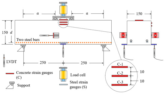 In this paper, we examined the structural behavior of UHPC beams (Table 6) under four-point loads. The beam testing setup is illustrated schematically in Figure 6. Test beams were run on an AMSLER hydraulic universal test machine with a capacity of 2000 kN and a loading rate of 0.4 mm/min. In total, five sets of equipment were used in the testing process. Three strain gauges measuring 60 mm were positioned at different locations on the concrete surface to assess strains. Prior to casting, two electrically sensitive strain gauges of 5 mm size were fastened to the steel rebars for strain measurements. Thirdly, two LVDTs were mounted vertically over the beam’s midspan to detect its vertical displacement. Attaching two horizontal LVDTs near the beam’s centerline allowed the beam’s crack width to be measured. Additionally, loads applied to actuators were measured directly through direct connections between actuators and load cells. The above-described instrumentation data was synchronized using Tokyo Sokki, model TDS-630, with a speed of 1000 channels in 0.1 s.
