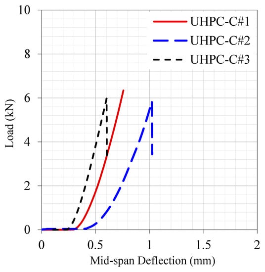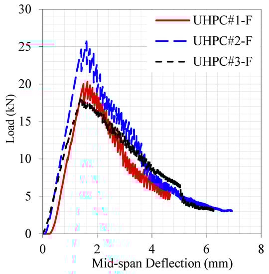 In general, fiber-reinforced UHPC has a tensile strength of 15–20 MPa. In comparison, UHPC without steel fibers exhibited almost half of this tensile strength [48]. According to several researchers, the compression strength should exceed 120 MPa [48,49,50]. As discussed above, all mixes were designed to achieve a characteristic compressive strength of 130 ± 10 MPa. The addition of fibers usually does not significantly affect the compressive strength. However, the principal benefit of adding fibers is improving the post-cracking performance of concrete. Therefore, a flexural strength test was conducted to assess the effects of fibers. Figure 7 shows the load-deflection curves of plain concrete prisms (40 × 40 × 160 mm) under the flexural strength test.