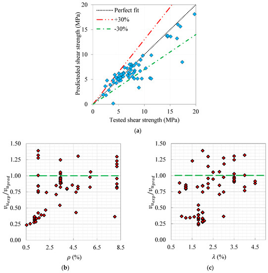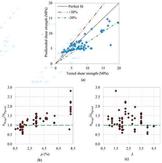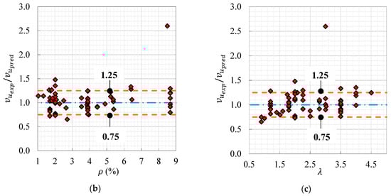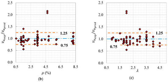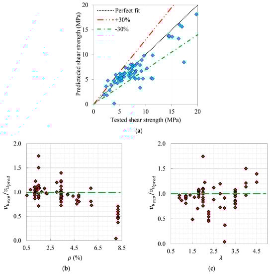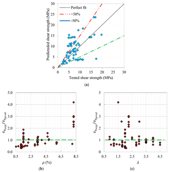 where, is the tensile strength of concrete (would be estimated by Equation (2), where is the cylindrical compressive strength of the FRC). Figure 9 shows that the mean of tested-to-predicted of Equation (1) and its coefficient of variance were 1.09 and 68.1%, respectively, and the error band was in the range of ±50%. The primary concern with regard to Equation (1) is that it does not account for the percentage of the longitudinal reinforcement (). Figure 9a showed that Sharma’s model notably underestimated for beams with high (more than 6%). Additionally, Equation (1) generally undervalued the influence of . This formula is likely to provide an over-design of less than two and would result in an unsafe design for slender beams (). It is worth noting that this finding is in accordance with that reported by Kwak et al. [45].