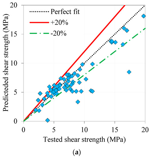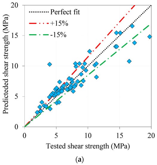 Figure 13 shows the prediction performance of the proposed robust model. With exception of two outliers, this figure established the rationality of the proposed model in the estimation of the shear strength of UHPC beams. The majority of the tested to predicted data points were in the range of 0.75 to 1.25, whereas the deviations of tested–predicted data from the perfect fit line were approx. in the range of ±20%.