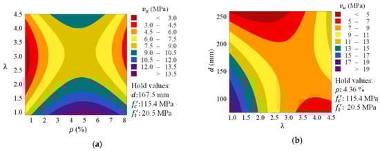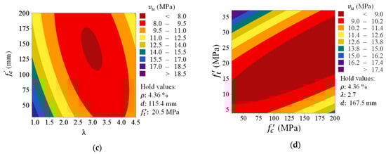 The establishment of the previous factorial-based model (Equation (5)) aids the construction of the response contours that leads to an insight into the influence of various parameters on the response surface. Figure 14 shows the combined impact of different factors on the shear strength of UHPC beams. This figure may aid the design of such beams, as well as help in gaining and insightful understanding of the impact of these parameters on