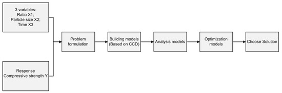 Material selection and maximising the formulation of the ideal composition were closely associated in this study. As a result, the RSM approach was used in this study to ascertain the optimal value of the interaction between various factors. The interaction that needs to be explored in this study involves the formation of eco-bricks using the best combination of PET particles and epoxy resin. Level 2 polynomial methodology was used in this RSM model. This method explained how different factors interact with each other even though researchers were not aware of the details of the process [15,33,34].