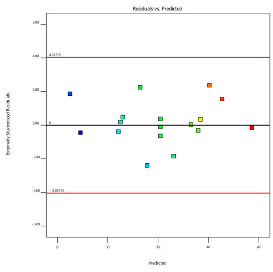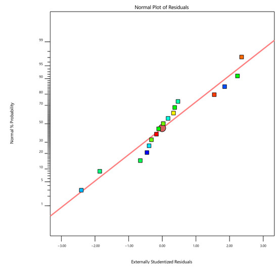 The model adequacy assessment was carried out to confirm that the proposed model could accurately describe the actual phenomenon. Residuals were evaluated using ANOVA value hypotheses for the satisfaction model. The standard deviation that corresponds to the empirical and computed values was calculated using standardised residuals. The typical likelihood values’ relationship to external residuals is shown in Figure 4. Additionally, Figure 4 shows a linear relationship between exterior residuals and normal likelihood values. The fact that every residual is close to the fit line related to the data model indicates that the model does have a normal distribution and is therefore able to predict empirical observations. The optimisation-specific studies indicated that the good model must have a normal distribution [24,25].