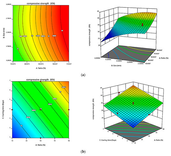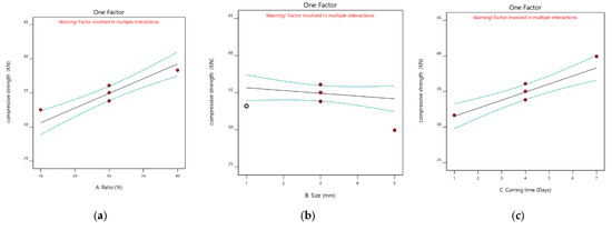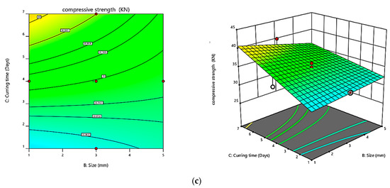 An indicator-compression test that includes the three response-regulating factors (size, ratio, and cure period) can be used to map a response boundary to demonstrate the response surface model. Figure 7 depicts the generated contour plot with different colours denoting the output response interval. Compressive strength fluctuation based on a ratio is shown in Figure 8a. The findings in the study suggest that a higher ratio corresponds to a higher measured compression value. The fact that epoxy resin performed better in the compression test demonstrated that it had a solid structure. The results in Figure 8b indicate that the larger PET particles decreased the compressive properties. As a result, the eco-bricks must be constructed using small particles for improving their compressive strength. Additionally, the results in Figure 8c indicate that a longer curing period could offer better compression test results.