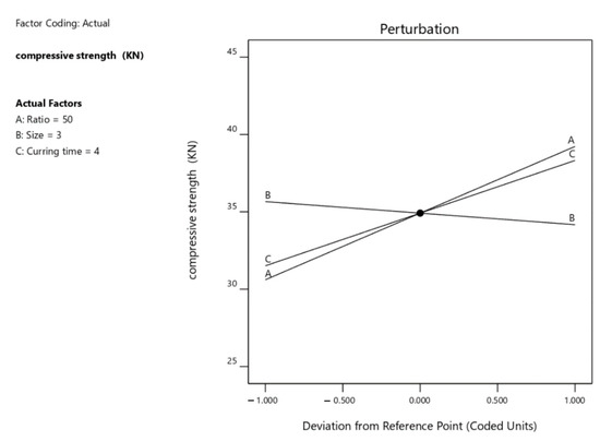 The perturbation graph makes it easier to assess how different factors will affect a particular region in the design space. Except for one parameter, the other parameters were kept constant, and the outputs were charted. The perturbation plot can be used to comprehend the magnitude of the reaction to particular aspects. Curved plots demonstrate that a particular parameter impacts the output. A considerably flatter result, however, implies that the selected factor mildly affects the final output. The relative significance of factor responses related to several factors can be better understood using distraction charts. Figure 9, which displays the relationships between the different process variables using the centre of compressive test results, shows the perturbation properties of the eco-bricks. The perturbation chart revealed the findings of a particular parameter while keeping the other parameters constant and the selected parameter deviated from the designated reference coordinates. In this study, the centre of the design space was selected as a reference coordinate, which corresponds to the 0-point for each parameter.
