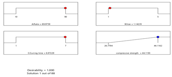 Based on the factor ranges depicted in Table 13 and the desired response, Design-Expert software was utilised to perform a numerical optimisation. The results of optimisation are shown in Figure 10. The ideal parameter ratio (A) is 89.9%, whereas the optimum particle size (B) and curing time (C) were 1.1 mm and 6.9 days, respectively. As a result, the desired compressive properties suggest a strength of 44.1193 MPa. In terms of the response variable, a desirability moving towards a value of one was selected as the most important factor.