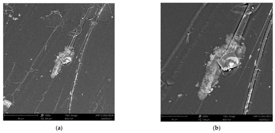 SEM images—1000× magnification and 2000× magnification. (a) SEM analysis of an eco-brick; magnification 1000×. (b) SEM analysis of an eco-brick; magnification 2000×.
