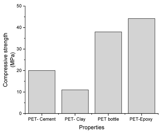 In this study, the compressive strength of PET-Cement, PET-Clay, PET bottle, and PET-epoxy resin was compared. The results of the compression test comparison can be seen in Figure 13. Eco-bricks mixed with epoxy resin and PET have higher compressive strength compared with the compressive strength of the other mixes.