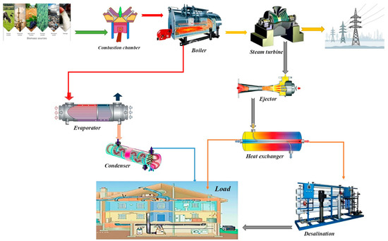 Geng, D. and Gao, X [8] proposed the thermodynamic and exergoeconomic optimization of a novel cooling, desalination and power multi-generation system based on ocean thermal energy. This study proposed a novel combined cooling, desalination and power (CCDP) system consisting of an open-ocean thermal energy conversion (OTEC) cycle, a dual-Kalina cycle, an ejector refrigeration cycle (ERC) and reverse osmosis (RO) desalination. Wang et al. [9] presented the techno-economic and techno-environmental assessment and multi-objective optimization of a new CCHP system based on waste heat recovery from the regenerative Brayton cycle. Xing, L. and Li, J [10] proposed a biomass/geothermal-hybrid-driven poly-generation plant centered on cooling, heating, power and hydrogen production with CO2 capture. The results of these numerical investigations showed that the system supplied net power of almost 22.23 MW, a 34.13 MW heating effect, a cooling effect of 96.40 MW, plus hydrogen generation of 124 kg/h. Additionally, the rate of CO2 capture was 4.32 kg/s. The exergy efficiency and energy efficiency of the system were estimated to be 17.87% and 79.47%, respectively. In addition, the plant had a total product cost rate of 1.162 USD/s and a sustainability index of 1.218. Wang et al. [11] presented the bi-level sizing optimization of a distributed solar hybrid CCHP system considering economic, energy and environmental objectives. Delgado et al. [12] presented an integration of cycles via absorption for the production of desalinated water and cooling. Askari et al. [13] presented the exergo-economic analysis of two novel combined ejector heat pump/humidification–dehumidification desalination systems.