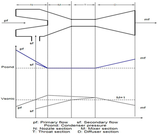 The ejector is a part of the system that converts the mechanical energy (pressure) of moving steam into kinetic energy (velocity) using convergence divergence. This factor creates a low-pressure area in the ejector, and as a result, the secondary flow is sucked into the ejector. When the fluid flow passes through the throat, the fluid is condensed, and the kinetic energy is converted into pressure. Figure 2 shows a schematic of the ejector and the profile of pressure and speed changes. To perform ejector calculations, Equations (21)–(26) are used [20,21]: