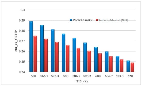 In Figure 3, the validation of the CCHP cycle second-law efficiency change chart in terms of heat source temperature changes is shown with reference to [24]. The largest difference between the calculated values and the values specified in the reference [24] is related to the temperature of 560 °K, and the percentage of this difference is about 4.3%.
