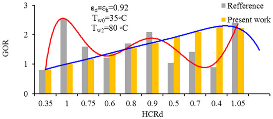 In Figure 5, the validation of the desalination system is shown in the form of a graph of changes in the gained output ratio (GOR) compared to the heat capacity ratio of the dehumidifier (HCRd) [25]. According to the figure, it can be seen that in HCRd = 1, the performance of the GOR has the highest value. In this system, the dehumidifier has the most irrecoverable properties. Additionally, the maximum performance of the system occurs when the dehumidifier conditions are in equilibrium. Theoretically, this state is represented by HCRd = 1.