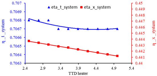 Effect of heat exchanger temperature change on energy and exergy efficiency of the system.
