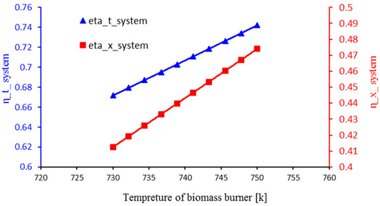 - The maximum amount of energy efficiency and exergy of the whole system in the range of heat source temperature between 740 and 750 is equal to 74.2 and 47.7.