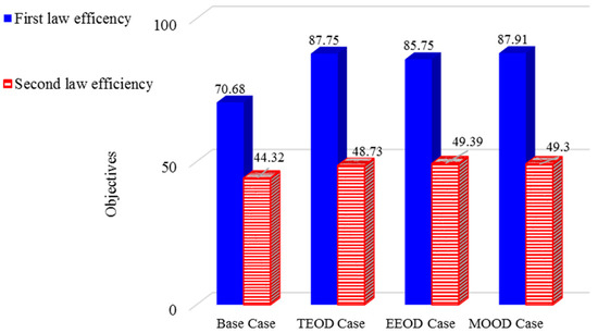 In Figure 12 and Table 4, the optimization results of the single-objective and multi-objective algorithms are presented, and the values of energy efficiency and exergy in the initial state and different modes (MOOD {w1 = w2 = 0.5}, EEOD, TEOD) were examined.