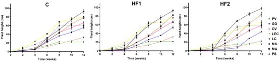 Shoot height of eight plant species (P.vulgaris (PV), G. orientalis (GO), O. viicifolia (OV), L. culinaris (LEC), L. corniculatus (LC), M. sativa (MS), M. albus (MA), P. sativum (PS)) grown for 12 weeks in control (C) and HF-contaminated (HF1—2.5 g kg−1, HF2—4 g kg−1) soil.