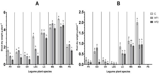 Shoot (A) and root (B) dry weight of all tested plant species for 12 weeks in control (C) and HF-contaminated (HF1—2.5 g kg−1, HF2—4 g kg−1) soil. Different letters indicate a significant difference (p < 0.05) among the treatments (LSD test) for each plant species.