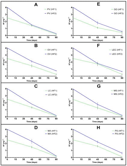 In the HF2 treatment, the best HF removal efficiency during the first 45 days, was obtained in the soil planted with P. vulgaris (PV) (62.50%), and the least removal was recorded in the soil planted with M. albus (MA) (42.50%). After 90 days, the best HF removal efficiency in the HF2 treatment was recorded in the soil planted with L. corniculatus (LC) (95.33%), M. albus (MA) (94.66%), and M. sativa (MA) (94.41%), while the lowest removal efficiency was in the soil planted with O. viciifolia (OV) (81.83%) and L. culinaris (LEC) (83.86%). There was no statistically significant difference between the HF removal efficiency depending on the initial HF concentration in the soil, except in the cases with O. viciifolia (OV) and P. sativum (PS) (LSD, p < 0.05).