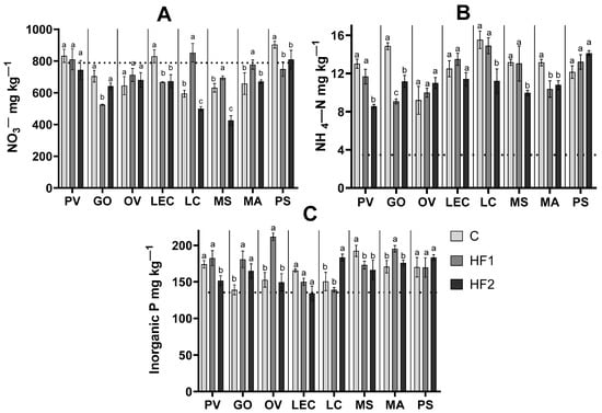 The final concentrations of nitrates (NO3−) (A), NH4-N (B), and inorganic phosphorus (P) (C) after 90 days in control (C) and HF-contaminated (HF1—2.5 g kg−1, HF2—4 g kg−1) soil, where eight plant species (P. vulgaris (PV), G. orientalis (GO), O. viicifolia (OV), L. culinaris (LEC), L. corniculatus (LC), M. sativa (MS), M. albus (MA), P. sativum (PS)) were grown. The dotted lines show the nutrient concentration in the control soil before the treatment. Different letters indicate a significant difference (p < 0.05) among the treatments (LSD test) for each plant species.