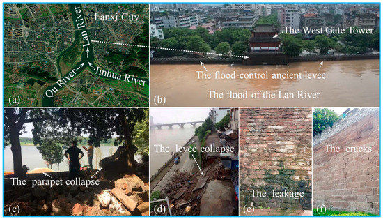 The location and damage characteristics of Lanxi’s ancient levee. (a) The location of the ancient levee, (b) the ancient levee under floods, (c) the failure of the upper part of the ancient levee, (d) the collapse of the ancient levee, (e) the seepage of the ancient levee, and (f) the bulging and cracking of the ancient levee.