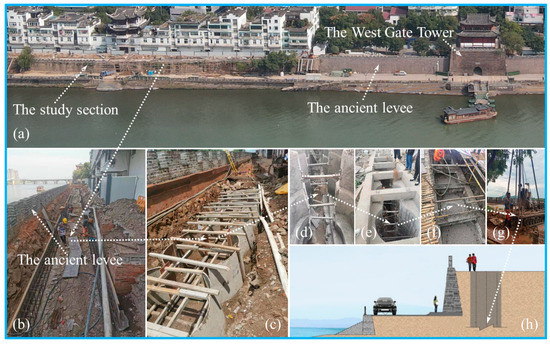 The ancient levee is located in the upper reaches of Lan River in Lanxi City, Zhejiang Province, China, and the lower reaches of the intersection of Qu River and Jinhua River (Figure 1a). It was built during the Northern Song Dynasty (at present, there are still about 600 m left, with a history of more than 1000 years) and rebuilt in the seventh year of Zhengde of the Ming Dynasty (1512). The levee is also used as a city wall and has military defense and flood control functions. As the water level at the intersection of the three rivers changes dramatically, it has been destroyed by water many times in history. Up to now, the levee is still used as an important flood control facility (Figure 1b), which plays a significant role in local flood control. The surface near the water side of the ancient levee is built with strip stones, the masonry material is local red sandstone, and the bonding material is a traditional lime slurry. Behind the stone levee is miscellaneous fill with a loose structure, poor uniformity, and large seepage coefficient, and the levee body has collapsed many times (Figure 1c,d). There are a lot of seepage and stability problems in the levee body and foundation (Figure 1e), and many sections also appear bulging and cracking (Figure 1f).