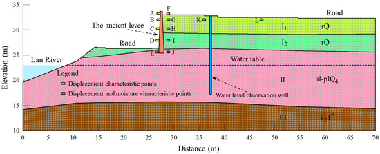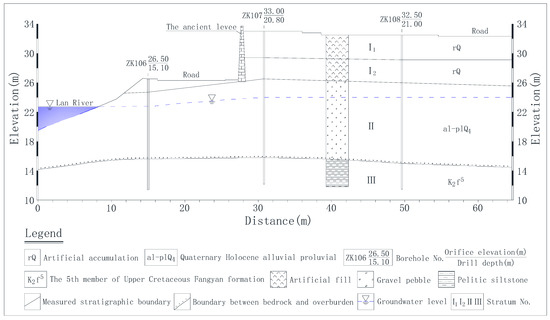 According to the geological and hydrological conditions and the representativeness of the layout of the ancient levee in the whole reinforcement section, the geological cross-section of the typical cross-section of Lanxi’s ancient levee is shown in Figure 3. The geological materials of this section are divided into four layers, of which the first to second layers (I1, I2) are both artificial fills, and the third and fourth layers are, respectively, sandy gravel cobble and argillaceous silt rock layers. The levee is built with red sandstone, about 8.0 m high, of which the parapet is 1.0 m high, and the included angle between the levee and the horizontal plane is 88°.