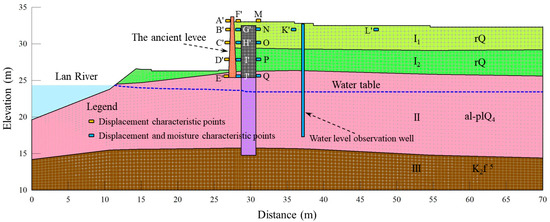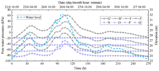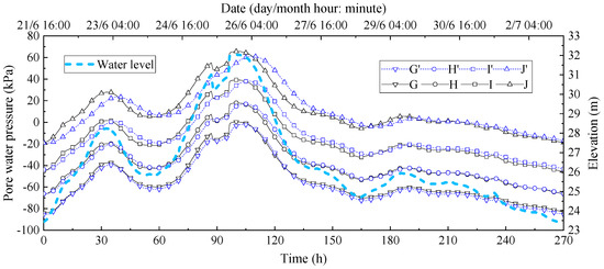 It can be seen in Figure 10 that the change law of the pore water pressures of the reinforced and unreinforced ancient levee fills are consistent with the water level fluctuation law of the Lan River. Because the soil seepage process takes a certain time, the change of pore water pressures is slightly delayed in time, and the change rate is smaller than the water level change rate. The characteristic points G′, H′, I′, and J′ are closer to the ancient levee than the characteristic points G, H, I, and J, while the lag time of the pore water pressure change of the characteristic points G′, H′, I′, and J′ of the levee filling is increased, which may be the blocking effect of the upside-down hanging well and curtain grouting on seepage. In space, the pore water pressures of G′, H′, I′, and J′ decrease with increasing depth.