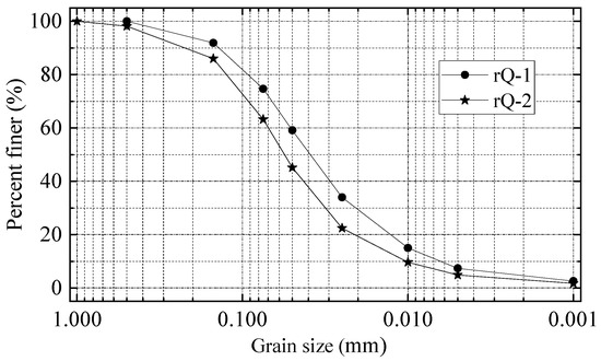 The particle grading curves of the soil samples.