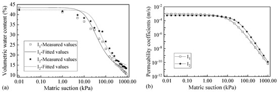 The SWCCs and relationship curves between seepage coefficients and matrix suctions. (a) The SWCCs and (b) the relationship curves between seepage coefficients and matrix suctions.