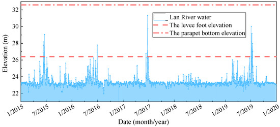 The ancient levee is located downstream of the intersection of the Lan River, Qu River, and Jinhua River, and the water level fluctuates violently. The water level change process of the river reached near the ancient levee in five recent years is shown in Figure 8.