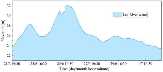 To simulate the impact of water level changes on the stability of Lanxi’s ancient levee, according to Figure 8, the maximum flood in five recent years occurred in June 2017 and was selected as the boundary condition of transient water level and hydrostatic pressure, and a total water head varying with time was applied from the bank slope of Lan River to the levee’s body, as shown in Figure 9.