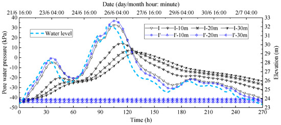 To explore the variation law of pore water pressures of the levee filling, an analysis is performed at points 10 m, 20 m, and 30 m horizontally from the characteristic points I′ and I (expressed as I′-10 m, I′-20 m, I′-30 m and I-10 m, and I-20 m and I-30 m), as shown in Figure 12.
