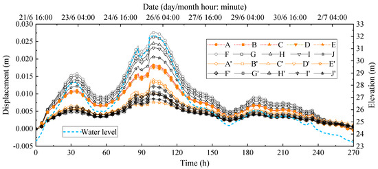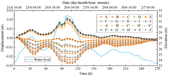 It can be seen in Figure 13 that the horizontal displacement change of the ancient levee is basically consistent with the horizontal deformation law of the fill during the flooding process, and its horizontal displacements before and after reinforcement are opposite. Before reinforcement, the maximum horizontal displacement of point A reached 2.75 cm, and the displacement was toward the Lan River. This was caused by the soil deformation squeezing the levee after the water level rose. This deformation was extremely unfavorable to the levee’s stability. The change of the horizontal displacement at other characteristic points is also significant, and the variation amplitude between different positions is large. This phenomenon is mainly caused by the change in the pore water pressures. After reinforcement, the ancient levee and the fill shifted away from the direction of the Lan River, which was triggered by the hydrostatic pressure caused by the rising water level. It also showed that during the flooding process, the soil moisture behind the upside-down hanging well and curtain grouting changed little, and the stability of the fill was good. There is no obvious difference between the horizontal displacement of the ancient levee and the fill. The fill displacement is generally larger than the levee displacement. The maximum horizontal displacement of point A′ is 2.16 cm, 0.59 cm less than that before reinforcement. After reinforcement, the displacement direction of the ancient levee changes and the displacement value decreases, which is beneficial to its stability.