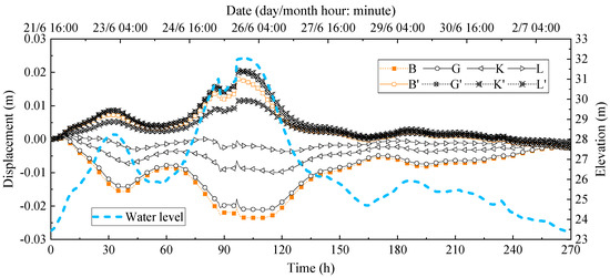 Under the above circumstances, the horizontal displacements of the points far from the well are more insensitive to the change in the river water level. To explore the horizontal displacement of the ancient levee and the fill before and after reinforcement, the horizontal characteristic points B, G, K, and L before reinforcement and the horizontal characteristic points B′, G′, K′, and L′ after reinforcement are extracted, and the change law of their horizontal displacement is analyzed, as shown in Figure 15.