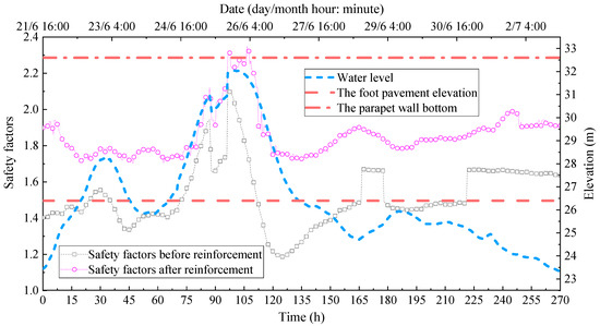 The water level variation in the Lan River will cause changes in soil, water, and stress fields. Due to the anti-seepage effect of the upside-down hanging well and curtain grouting after reinforcement, it is difficult for the river water to penetrate the fill behind the well, which dramatically improves the safety factors of the ancient levee. The relationship curves between the safety factors of the ancient levee before and after reinforcement during the 2017 flooding process are shown in Figure 17.