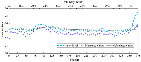 The comparison between monitoring data and calculated values of the water level near the section from 17 March to 1 April 2021.