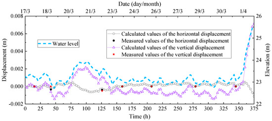 The comparison between measured data and calculated values of the horizontal and vertical displacement of the levee’s foot pavement during the construction period.